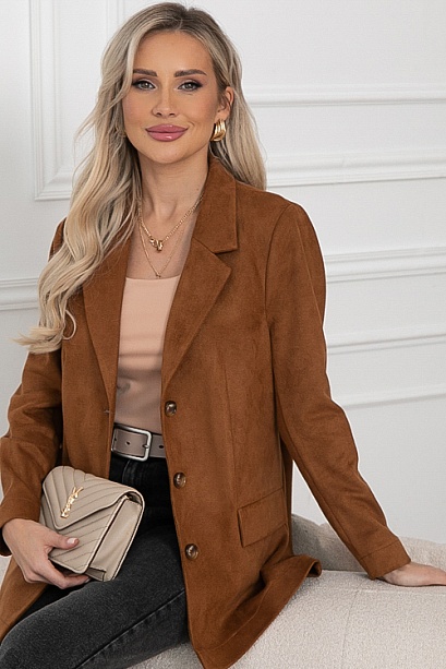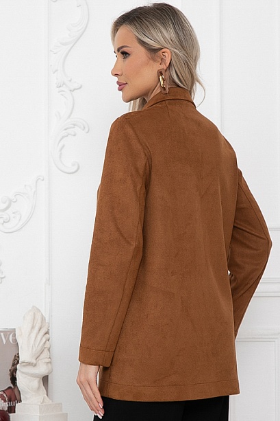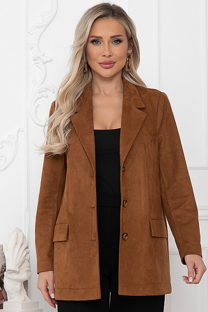 * Жакет свободного силуэта из экозамши,с центральной застежкой на три пуговицу. Воротник отложной с лацканами. По переду жакета функциональные карманы с клапанами.