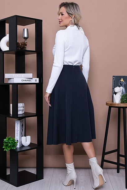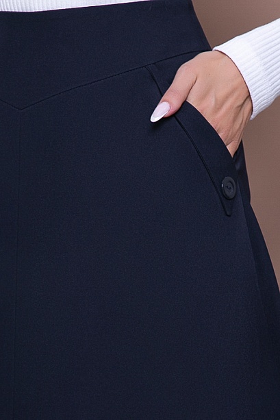 Юбка расклешенная из костюмной ткани. По переду фигурная кокетка,в боковых швах карманы с клапаном и декоративной пуговицей.По среднему шву спинки молния. Цвет: т.синий.