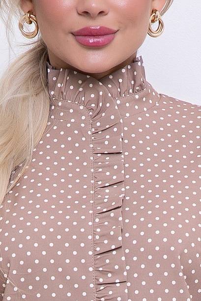 Блузка из текстильного полотна в горох. Горловина стойка с рюшей переходящая на полочку.По спинке застежка на навесную петлю и пуговицу.