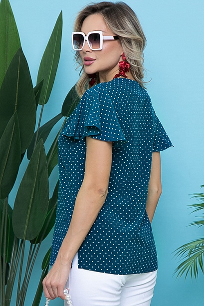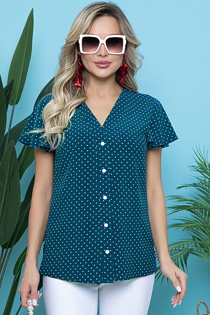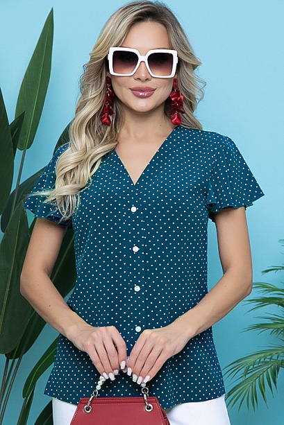 Блузка из текстильного полотна в горох с центральной застежкой на петли и пуговицы.