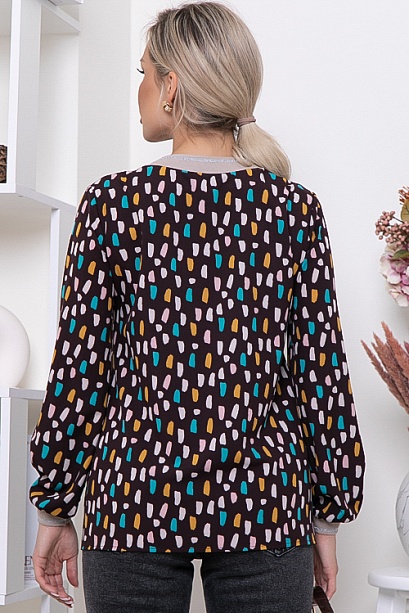 Блузка из текстильного полотна свободного силуэта с V-вырезом горловины.Манжеты и горловина-трикотажные подвязы.