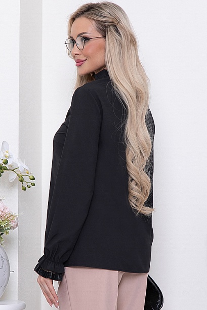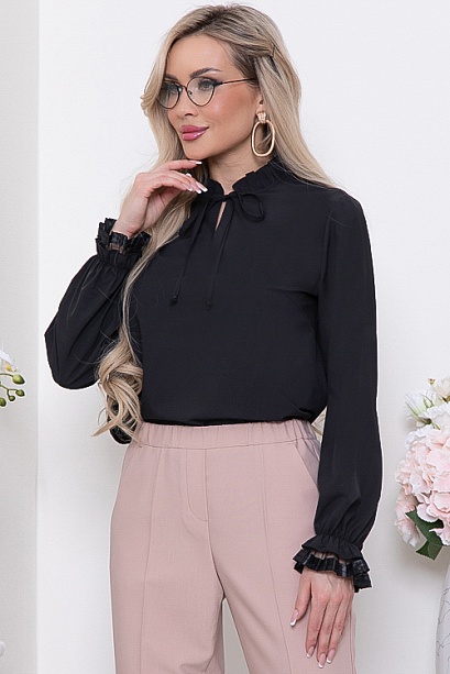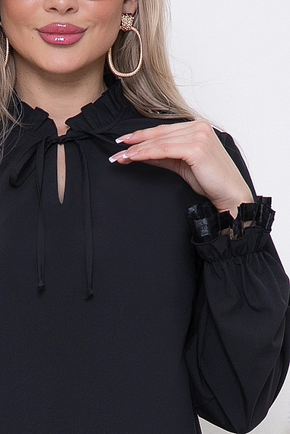 Блузка из текстильного полотна свободного силуэта.Горловина с рюшей и завязками.Рукава длинные украшены гофрированным воланом.