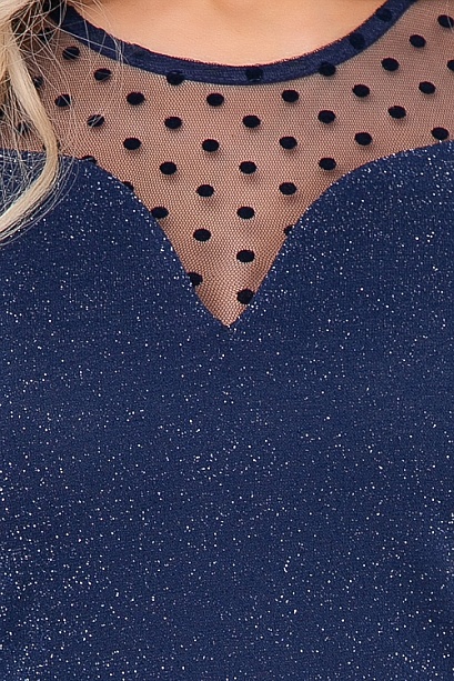 Платье из трикотажного полотна с блеском,горловина с фигурной кокеткой из сетки в горох.В среднем шве спинки застежка молния.