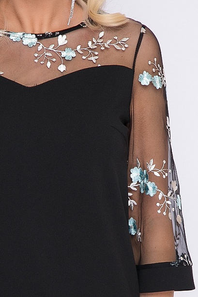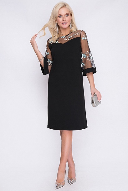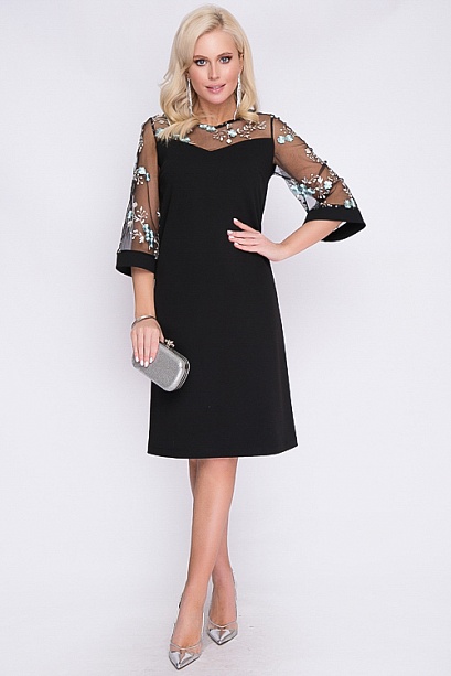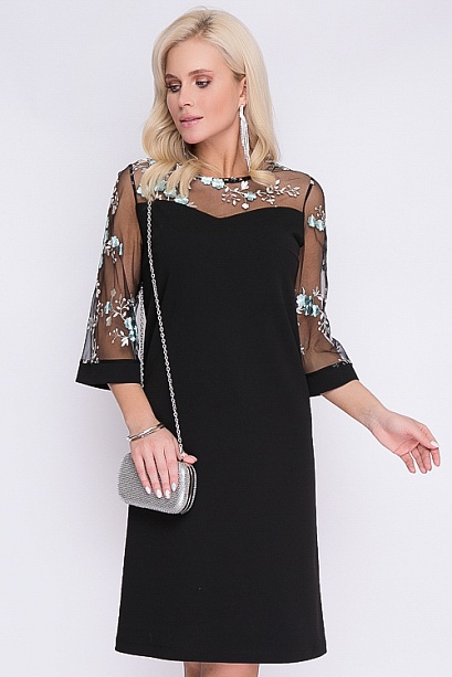 Платье А-образного силуэта из трикотажного полотна джерси.Кокетка и рукава из сетки с вышивкой.