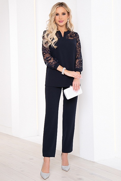 Комплект двухпредметный из трикотажного полотна,состоящий из брюк и блузона.Блузон комбинированный с кружевом свободного силуэта.Брюки прямые слегка заужены к низу,по поясу резина,без застежки,с имитацией гульфика.