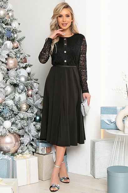Платье приталенного силуэта,отрезное по линии талии.Юбка полусолнце из текстильного полотна.Лиф из кружевного полотна на трикотажном подкладе.По переду лифа декоративная планка с металлическими пуговицами.Рукав втачной,кружевной.Ремень в комплект не входит. 30% вискоза 65% п/э,5% эластан