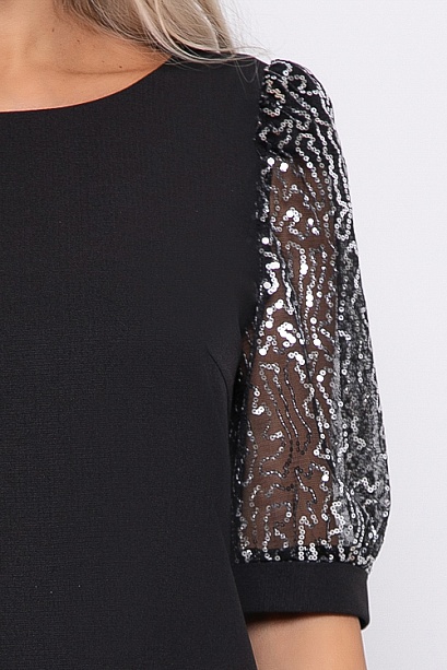 Платье из текстильного полотна А-образного силуэта с красивыми рукавами из сетки с пайетками.