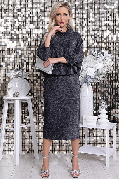 Платье из трикотажного полотна с люрексом,отрезное по линии талии с эластичной резиной,верх платья с воротом хомут,с цельнокроеными рукавами летучая мышь.Юбка прямая со шлицей в среднем шве спинки.