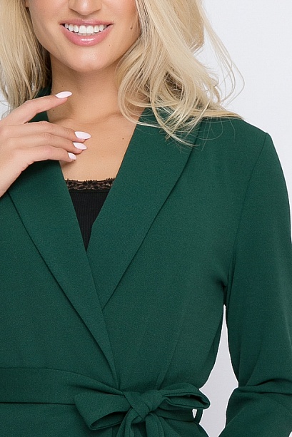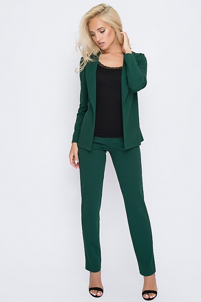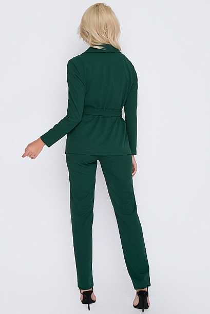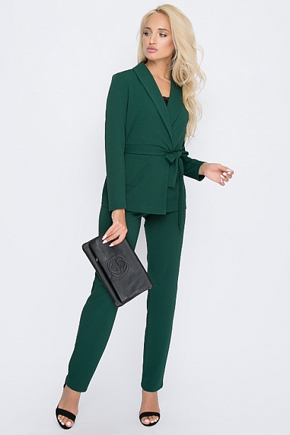 Комплект из трикотажа.Состоит из жакета  и брюк. Жакет прямого силуэта с шалевым воротником, без застежки, на запах, с завязывающимся поясом  по талии.Пояс съемный Брюки с резинкой по поясу. 30% вискоза 65% п/э,5% эластан