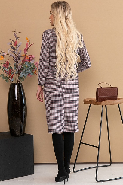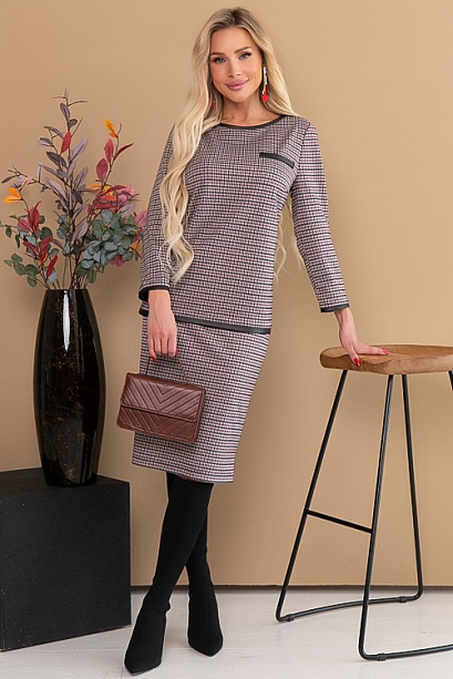 Комплект из плотного трикотажа в гусиную лапку.Блузон прямого силуэта с отделкой под кожу.Юбка карандаш с резинкой по талии.