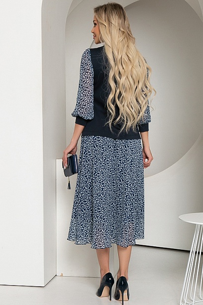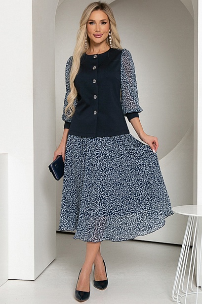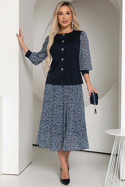 Комплект двухпредметный.Жакет из трикотажа джерси с рукавами из шифона,с центральной застежкой на петли и пуговицы.Расклешенная юбка из шифона с притачной резиной по поясу.