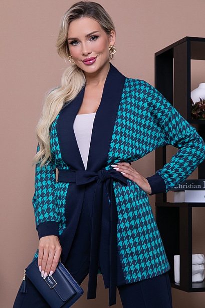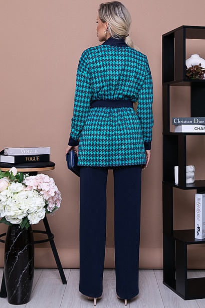 Комплект брючный из трикотажного полотна,состоящий из кардигана и брюк и поясом в комплекте. Состав: кардиган 75% вискоза,20% п/э,5% лайкра брюки 50% вискоза,45% п/э,5% лайкра