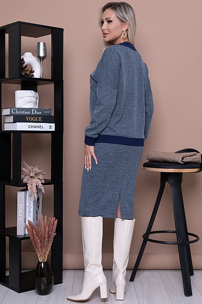 Комплект из джемпера и юбки из трикотажного полотна.Джемпер свободного силуэта со спущенным плечом и контрастной отделкой трикотажной рибаной.Юбка карандаш с разрезом в среднем шве спинки и эластичной резиной по поясу.