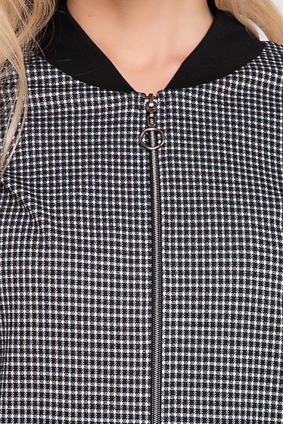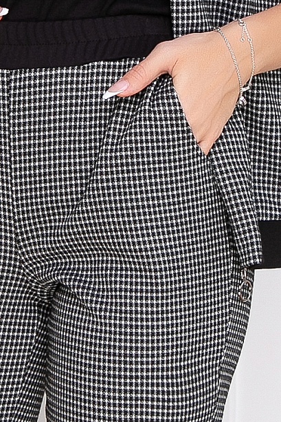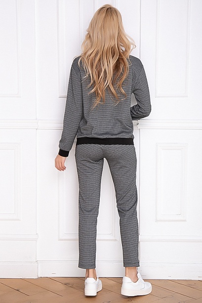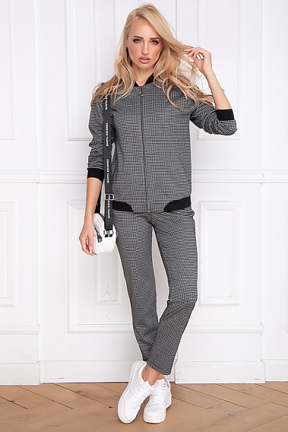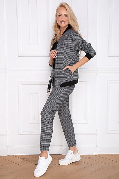 Комплект из трикотажного полотна в мелкую клетку,состоит из бомбера и брюк. 50% вискоза,45% п/э,5% лайкра