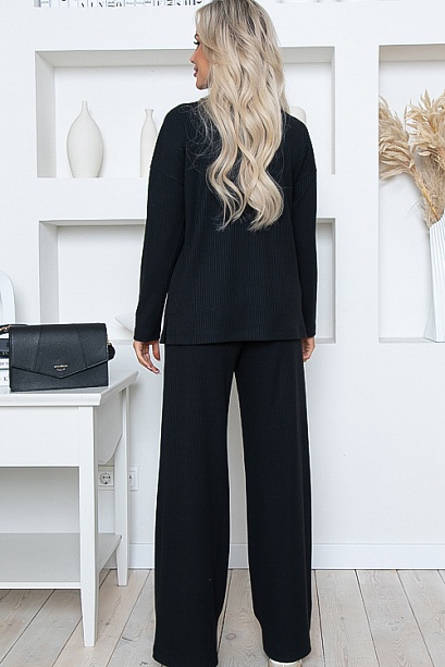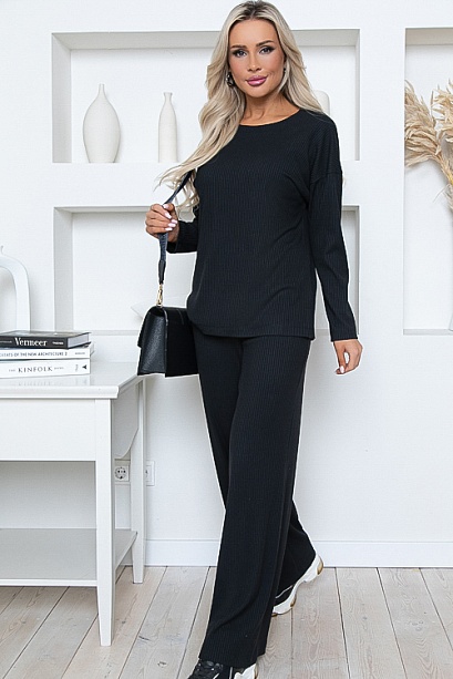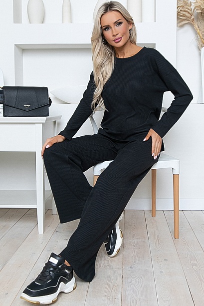 Комплект брючный из вискозного трикотажа лапша. Джемпер свободного силуэта со спущенным плечом и разрезами в боковых швах.Брюки расширенные к низу по поясу с эластичной резиной. Ремень в комплект не входит.