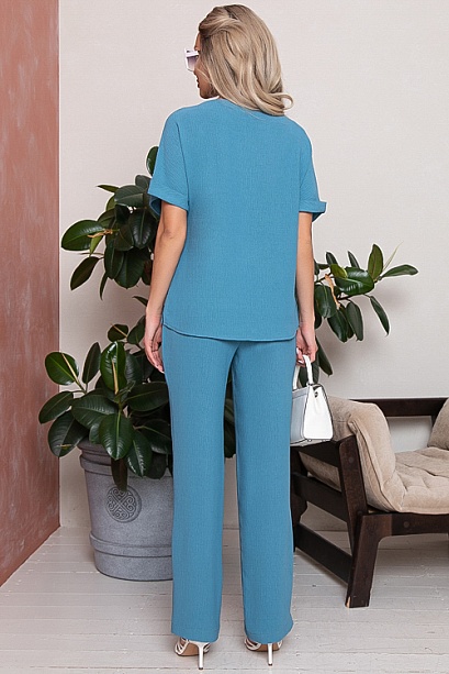 Брючный комплект из комфортного текстильного полотна.Блузка свободного силуэта с разрезами в боковых швах,с цельнокроеными рукавами и отложными.манжетами.Брюки свободного силуэта с посадкой по талии присборенные на эластичную резину.
