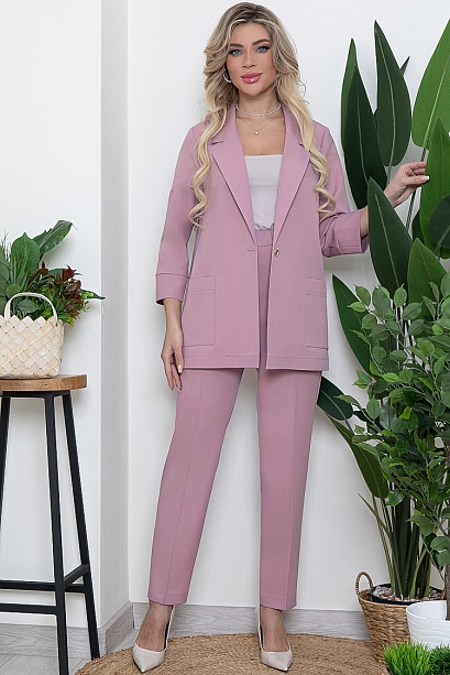 Брючный комплект из костюмной ткани.Жакет свободного силуэта с застежкой на одну пуговицу.Воротник отложной с лацканами.По переду жакета накладные удобные карманы.