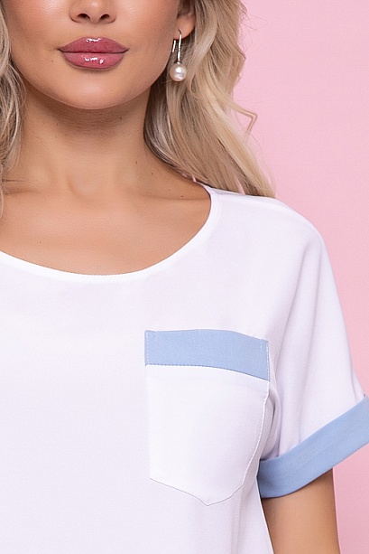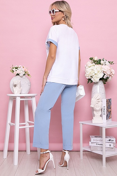 Комплект из брюк и блузки.Брюки из костюмной ткани зауженные к низу, по поясу эластичная резина .В среднем шве переда имитация гульфика.По бокам функциональные карманы.Заутюженные стрелки придают стройность фигуре.Блузка из текстильного полотна свободного силуэта с накладным карманам и контрастной отделкой.