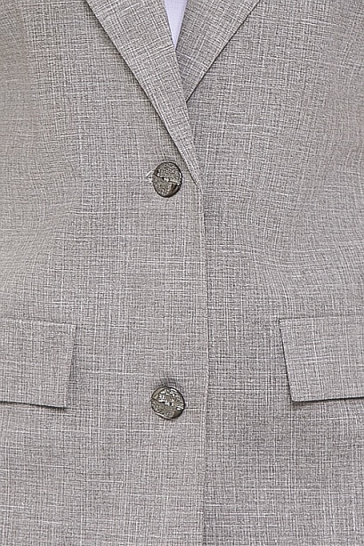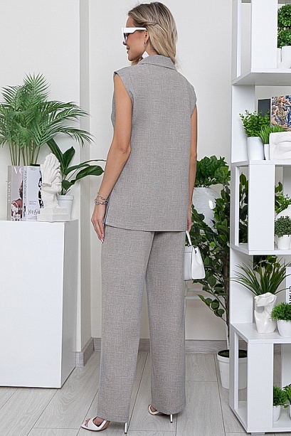 Комплект из легкой костюмной ткани.Жилет свободного силуэта на подкладе с центральной застежкой на две пуговицы Воротник отложной с лацканами.По переду прорезные карманы с клапанами, по бокам разрезы.Брюки свободного,прямого силуэта. удобную посадку по талии обеспечивает эластичный пояс на резинке с кулиской,В боковых швах функциональные карманы.