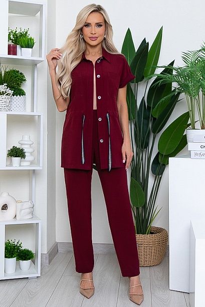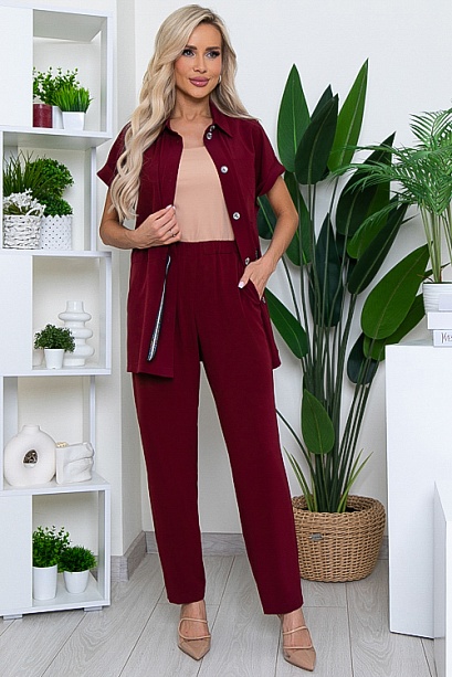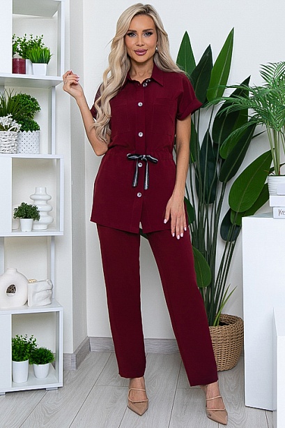 Комплект из текстильного полотна.Жакет с центральной застежкой,воротник отложной на стойке,по талии кулиска с поясом из декоративной тесьмы.Рукав цельнокроеный с манжетом по низу.По бокам разрезы.Брюки прямого силуэта без застежки,с имитацией гульфика по переду.с функциональными карманами по бокам и эластичной резиной по поясу.
