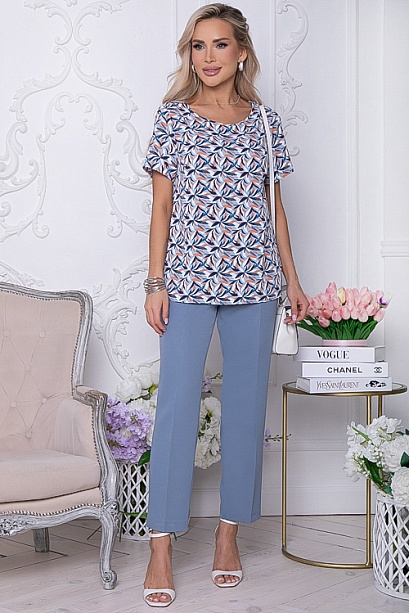 Комплект состоящий из блузки и брюк.Блузка свободного силуэта из текстильного полотна.