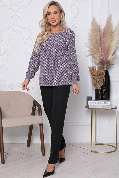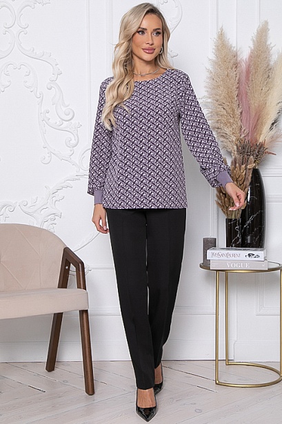 * Комплект состоящий из блузки и брюк. Блузка свободного силуэта из текстильного полотна, низ рукавов с манжетами из трикотажной рибаны.Брюки из костюмной ткани с высокой посадкой, зауженные к низу, по поясу эластичная резина .В среднем шве переда имитация гульфика. По бокам функциональные карманы. Заутюженные стрелки придают стройность фигуре.