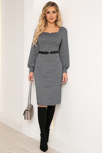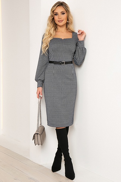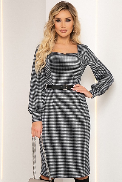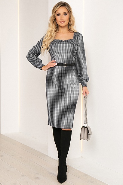 Платье из жаккардового трикотажного полотна полуприлегающего силуэта с фигурным вырезом горловины.