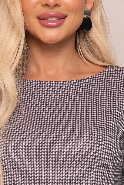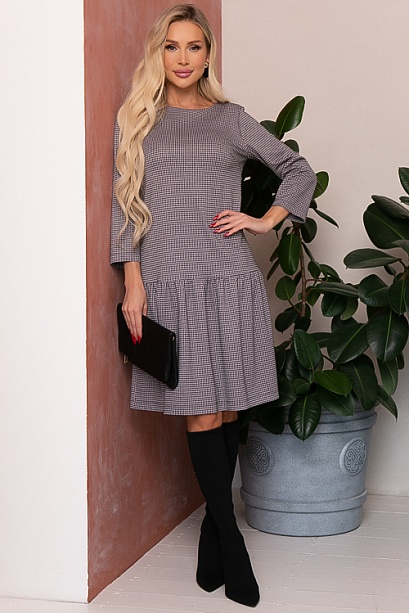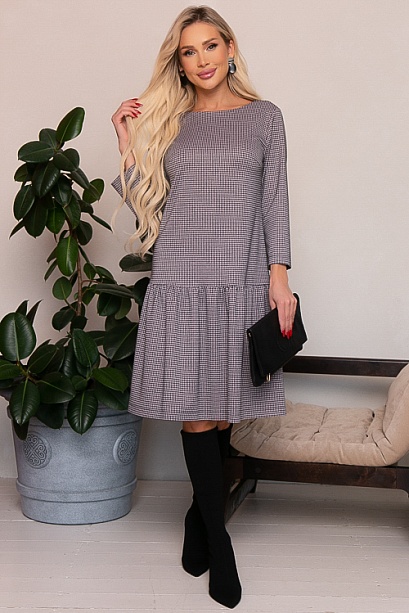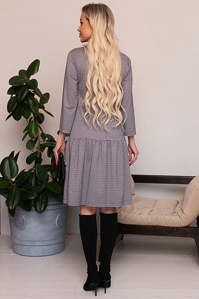 Платье А-силуэта из трикотажного полотна в гусиную лапку с притачным воланом по низу.