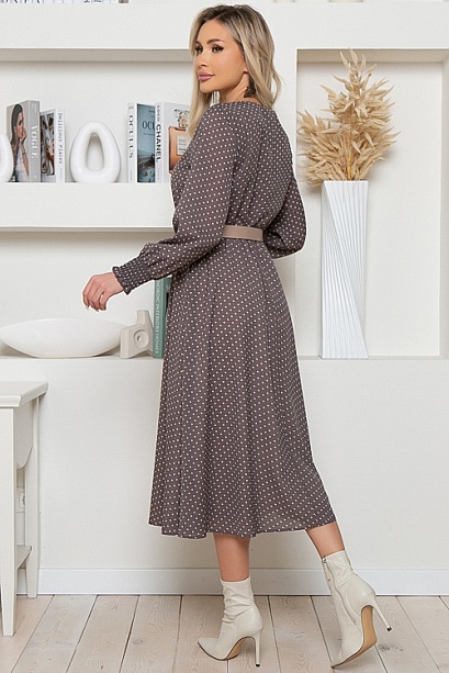 Платье из креп шифона отрезное по линии талии с расклешенной юбкой на трикотажном подкладе.Рукав втачной с высоким манжетом на резине и декоративной отстрочкой. Ремень в комплект не входит.