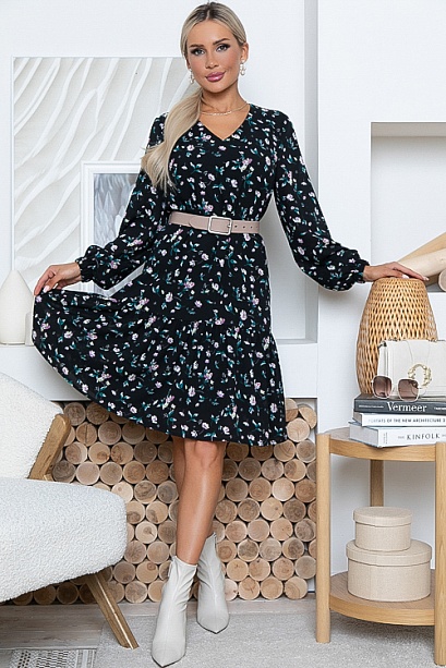 Платье свободного А-образного силуэта из креп шифона с притачным воланом по низу, на трикотажном подкладе.В комплекте пояс из основной ткани.Ремень в комплект не входит.Изделие можно носить как с поясом ,так и без. 30% вискоза 65% п/э,5% эластан