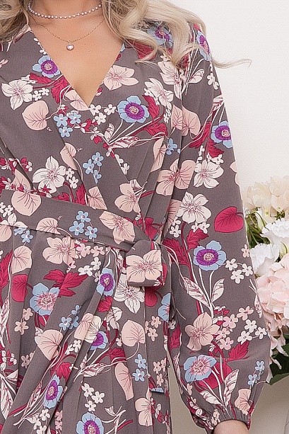 Платье из текстильного полотна,с красивым запахом по лифу,отрезное по линии талии,присобрано на эластичную резину, с летящей расклешенной юбкой с эффектным запахом по переду.Пояс из основной ткани в комплекте. 30% вискоза 65% п/э,5% эластан