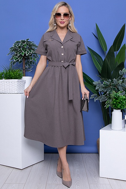 Платье в стиле сафари из костюмной ткани,отрезное по линии талии с расклешенной юбкой присборенной на резину.Лиф с цельнокроеными рукавами и центральной застежкой до талии на пуговицы,по переду декоративные клапаны.Пояс из основной ткани в комплекте. 15% лен,80% п/э,5% лайкра