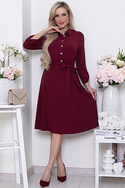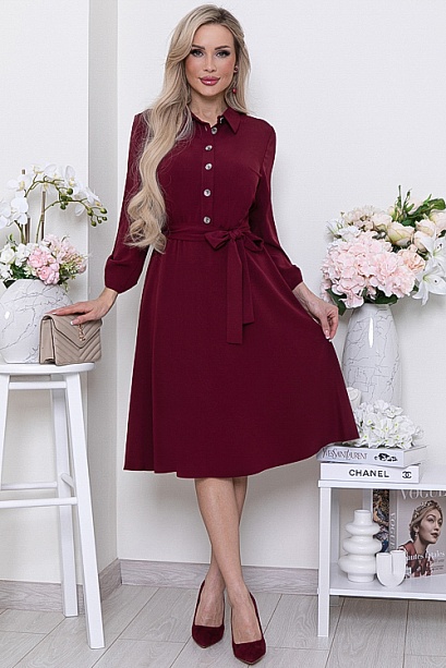 Платье из костюмной ткани,отрезное по линии талии с расклешенной юбкой присборенной на резину.Лиф с центральной застежкой до талии на пуговицы.Пояс из основной ткани в комплекте.