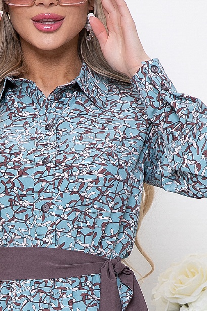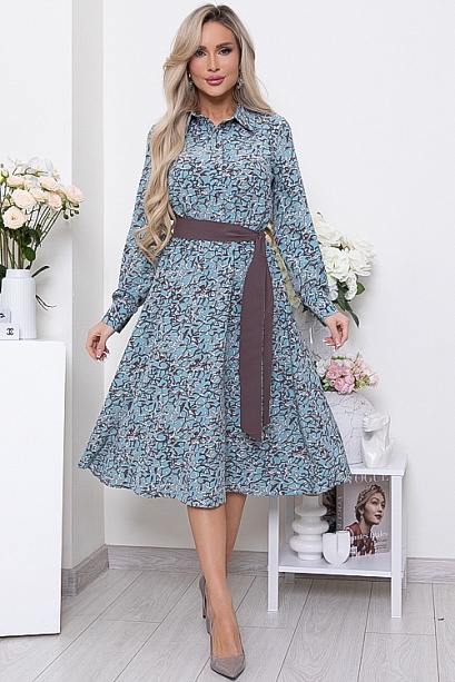 Платье из текстильного полотна,отрезное по линии талии,присобрано на эластичную резину.Горловина оформлена отложным воротником на стойке.По полочке-планка до талии с застежкой на петли и пуговицы.Юбка изделия расклешенная и летящая.В комплекте двухсторонний длинный пояс из основной ткани и однотонной,можно носить и так и так.