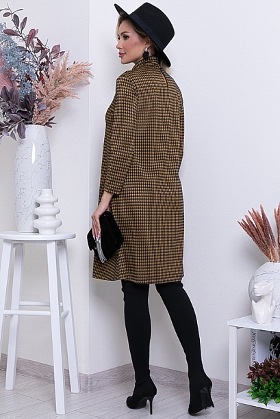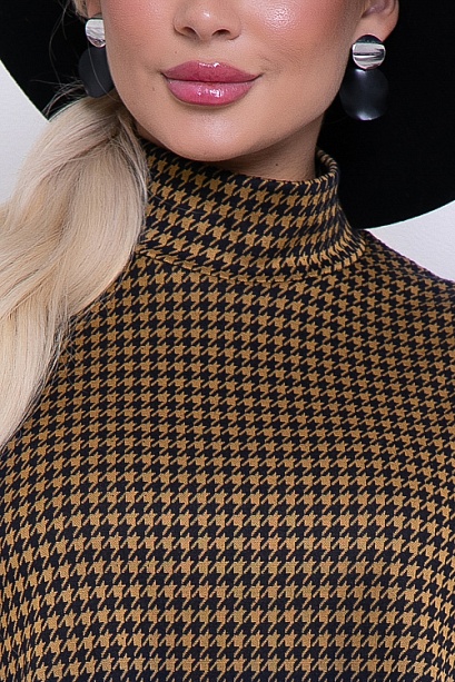 Платье из трикотажного полотна жаккардового переплетения трапецевидного силуэта,ворот стойка с застежкой на пуговицы сзади.Ремень в комплект не входит. 50% вискоза,45% п/э,5% лайкра