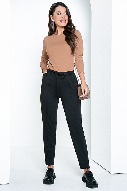 Комфортные брюки из трикотажного полотна,цвет черный,в боковых швах функциональные карманы,удобную посадку по талии обеспечивает эластичный пояс на резинке с кулиской,отстроченные стрелки по переду брюк по всей длине.