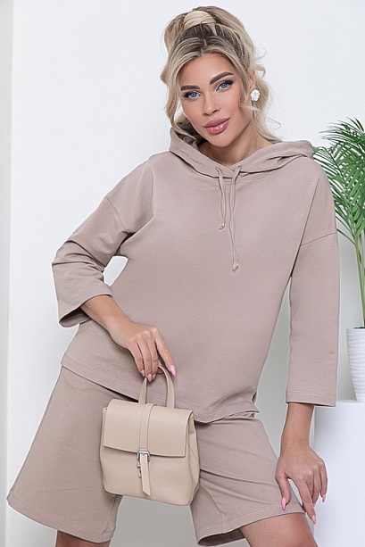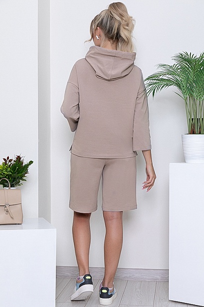 Брючный костюм из качественного трикотажного полотна футер(ткань производство Турция).Толстовка свободного силуэта со спущенным плечом и притачным рукавом с капюшоном и разрезами по бокам.Шорты прямого силуэта с посадкой по талии с функциональными карманами по бокам и эластичной резиной по поясу.