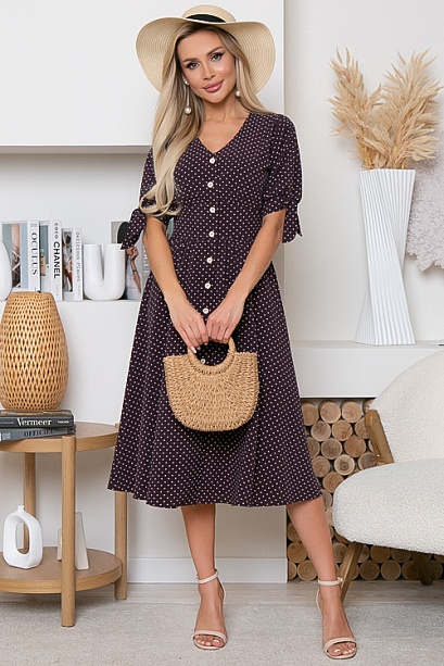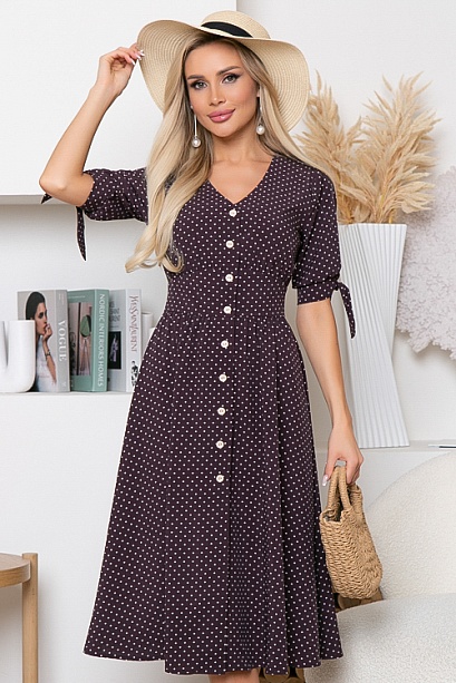 Платье из текстильного полона в горошек приталенного силуэта с фигурным поясом и расклешенной юбкой.Центральной застежкой на пуговицы до низа.