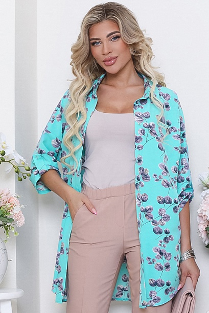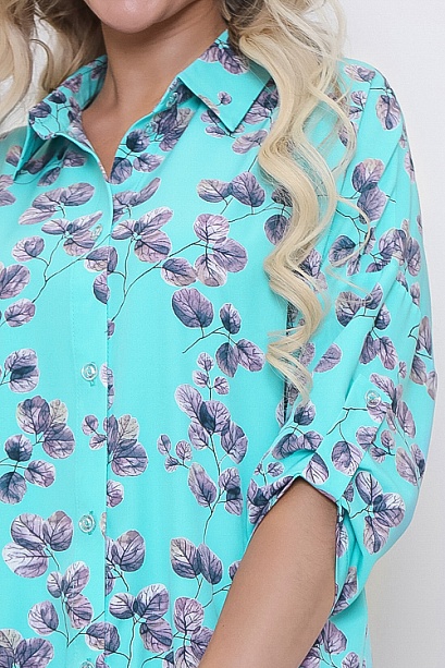 Рубашка из текстильного полотна свободного силуэта с центральной застежкой на пуговицы.Рукава притачные на основе цельнокроеного, по низу собраны на пату.Воротник отложной на стойке.По спинке кокетка. Ремень в комплект не входит.
