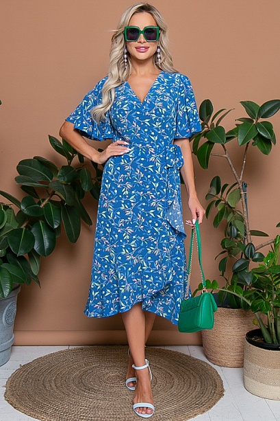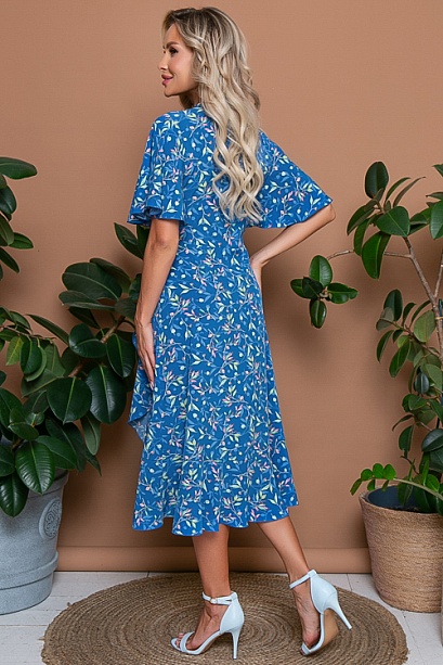 Платье из текстильного полотна с полным-функциональным запахом.По бортам вшиты пояски,которые завязываются и позволяют регулировать ширину платья по талии.Мягкий рукав-крыло и волан по юбке придают платью необыкновенную женственность.