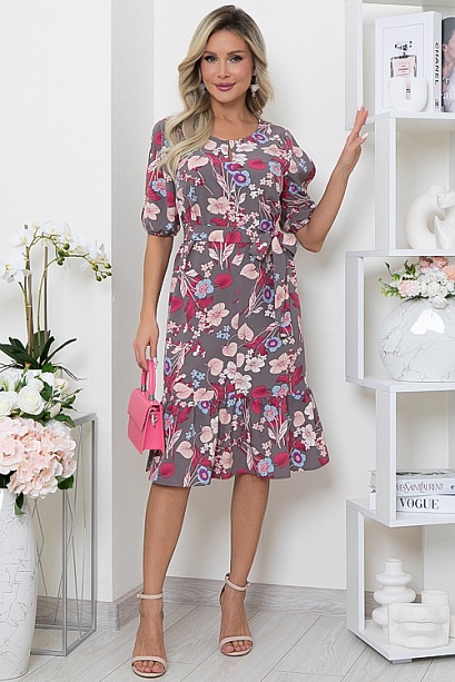 Платье из текстильного полотна А-образного силуэта с притачным воланом по  низу.Горловина оформлена эффектной каплей.Пояс из основной ткани в комплекте. 30% вискоза 65% п/э,5% эластан