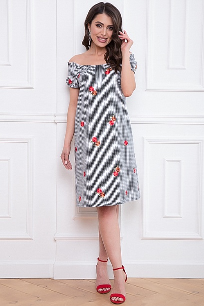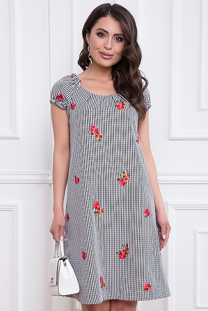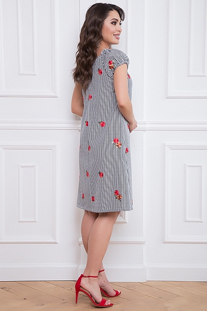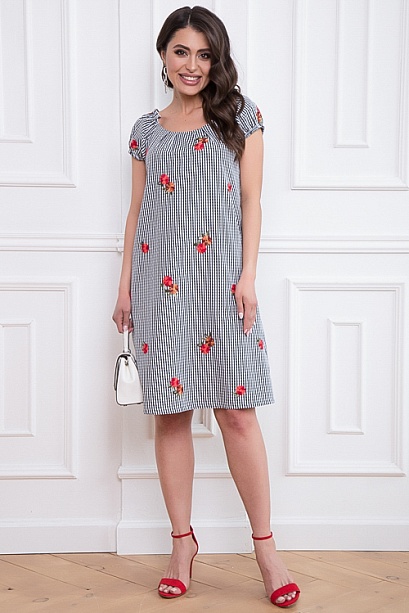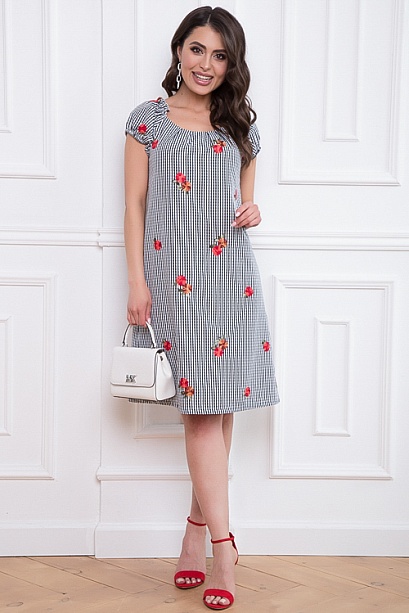 Платье из текстильного полотна А-образного силуэта в клеточку с вышивкой.Рукав можно носить как фонарик или "Анжелика" 50% хлопок, 50% п/э
