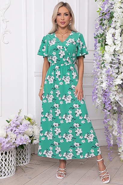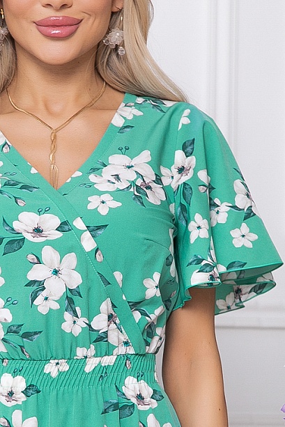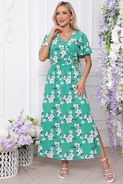 Платье из текстильного полотна,отрезное по линии талии с расклешенной юбкой и разрезами по бокам.Лиф с имитацией запаха.По талии платье собрано на широкую резину.