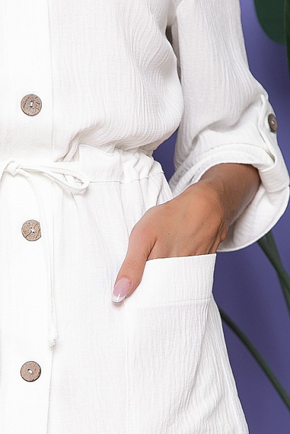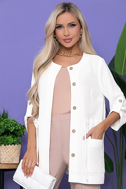 Жакет свободного силуэта из текстильного полотна.Центральная застежка на петли и пуговицы,по талии кулиска.По переду накладные функциональные карманы.Рукав втачной с патой.