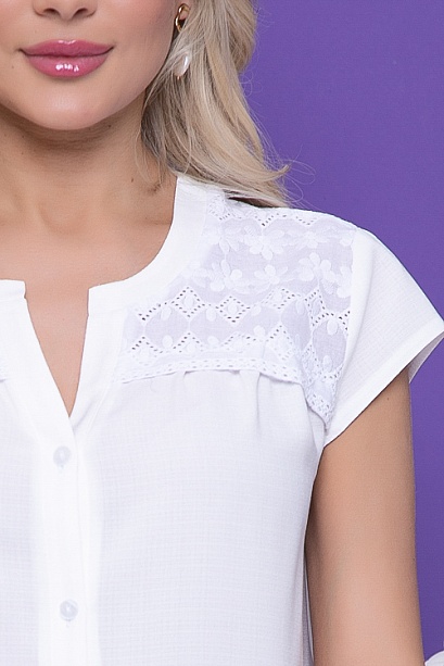 Комбинированная блузка-рубашка из легкого текстильного полотна и кокеток из хлопкового шитья.Центральная застежка на петли и пуговицы.