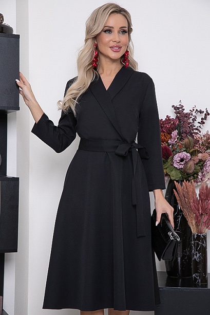 Платье из костюмной ткани,отрезное по линии талии с расклешенной юбкой. Перед лифа с запахом и шалевым воротником.Мягко завязывающийся пояс придает образу женственности.