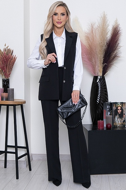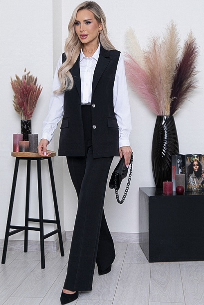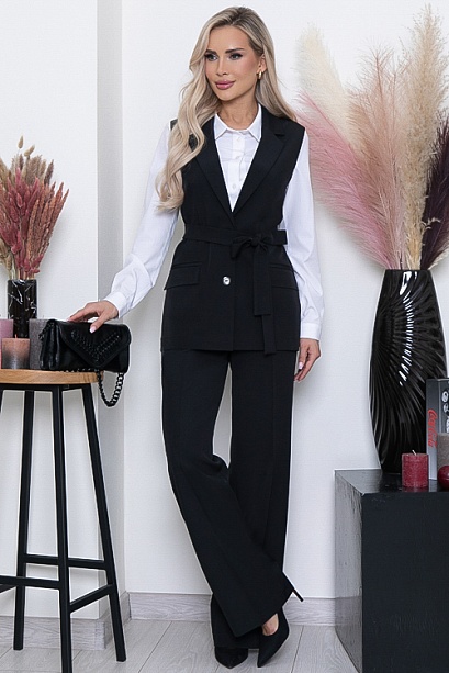 * Комплект из костюмной ткани состоящий из жилета и брюк.Жилет полуприлегающего силуэта ,с отложным воротником с лацканами и застежкой на две пуговицы.По бокам прорезные карманы в рамку и клапана.Брюки прямые,свободные с заутюженными стрелками,по бокам функциональные карманы.Пояс притачной с эластичной резиной по спинке.В среднем шве переда имитация гульфика.В комплекте пояс.Можно носить с поясом и без.