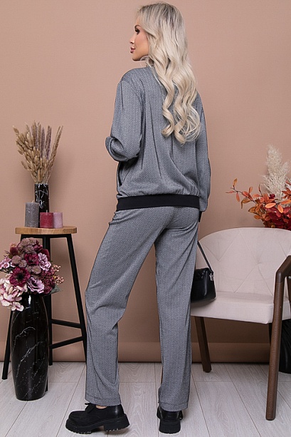 * Брючный комплект из жаккардового трикотажного полотна елочка с контрастной отделкой из черного джерси,состоит из бомбера и брюк.Бомбер свободного силуэта с центральной застежкой на молнию и прорезными карманами с листочкой из контрастной ткани.Брюки прямого силуэта с контрастным поясом с эластичной резиной,по бокам функциональные карманы.