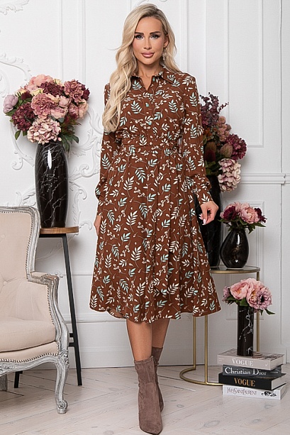 Платье из текстильного полотна,отрезное по линии талии,присобрано на эластичную резину.Горловина оформлена отложным воротником на стойке.По полочке-планка до талии с застежкой на петли и пуговицы.Юбка изделия расклешенная и летящая.В комплекте длинный пояс из основной ткани.