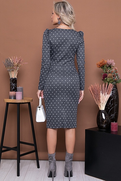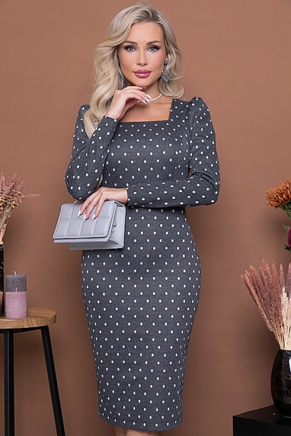Платье в горох из комфортного трикотажного полотна жаккардового переплетения с вырезом каре.Ремень в комплект не входит. 60% вискоза,35% п/э,5% лайкра